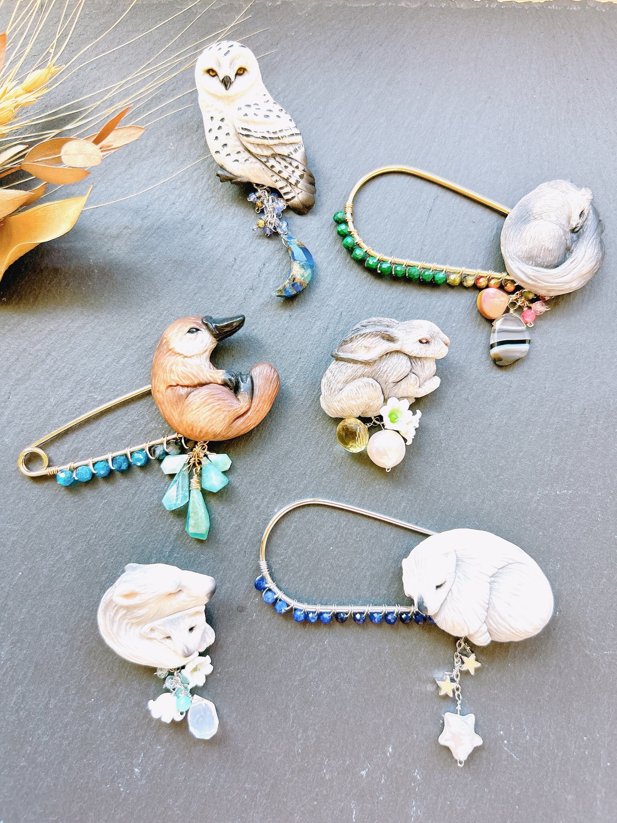フクロウが月夜に木陰でたたずんでいるようなロマンチックな世界観を目指し、タンザナイトとパイライトで星空を作り、仕上げに青い月を添えて。