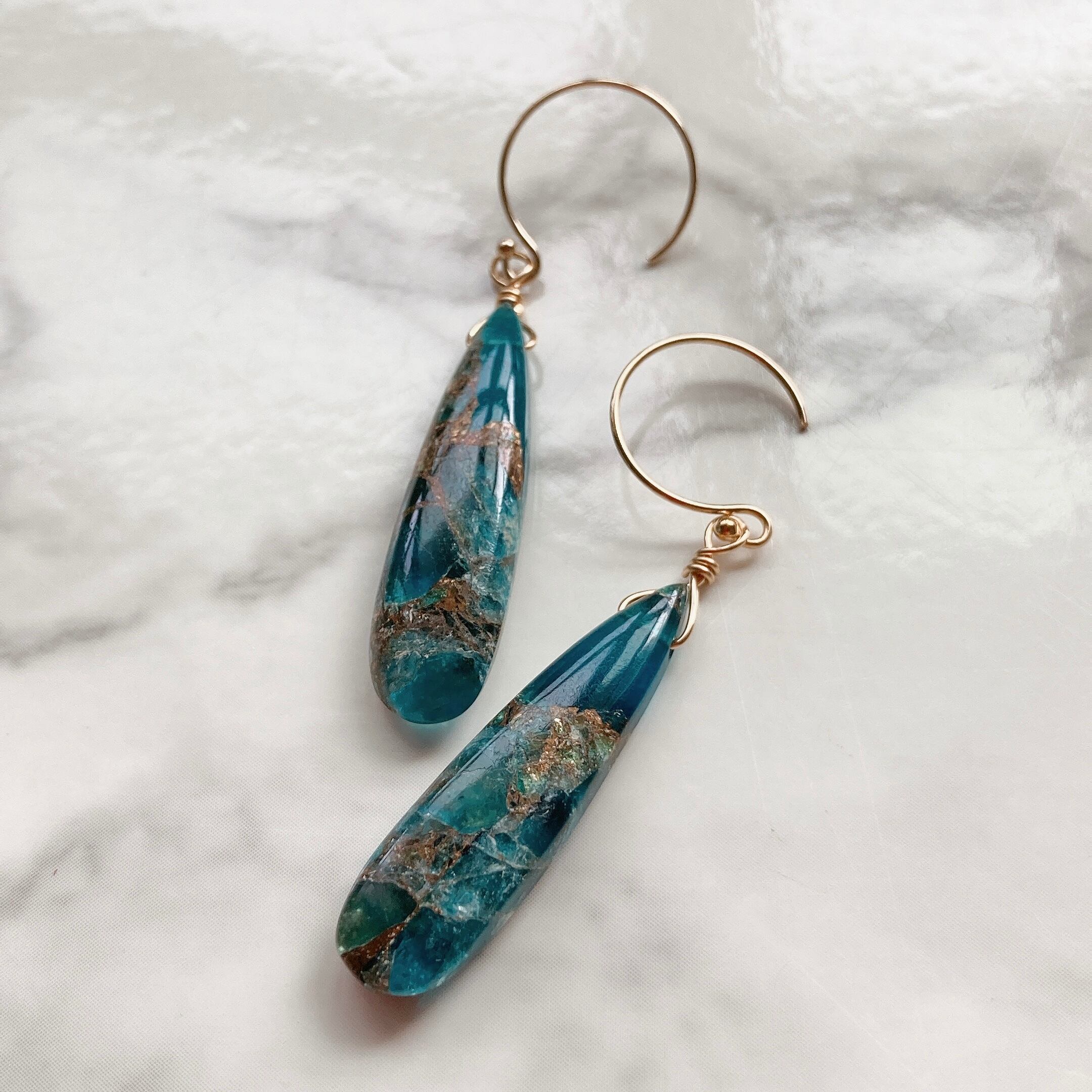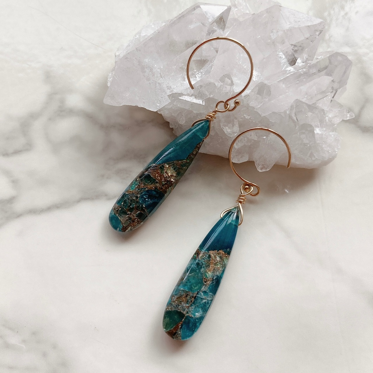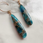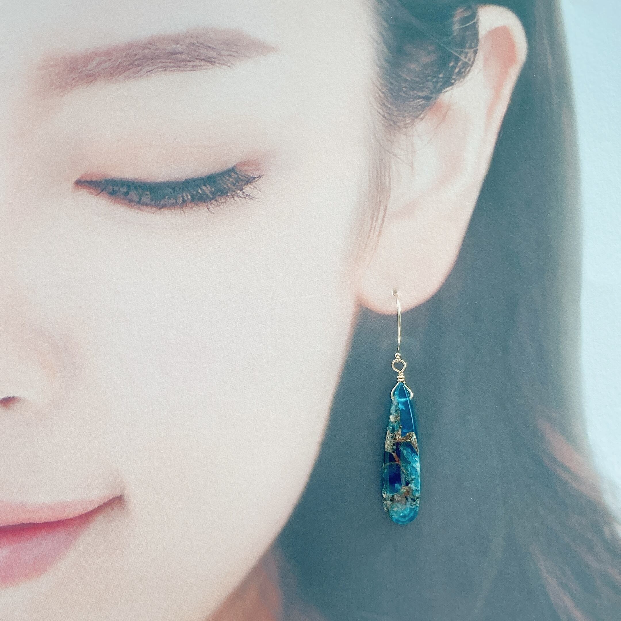 深い森の湖を思わせる美しいコッパービーズを潔く一粒ピアスにお仕立ていたしました。