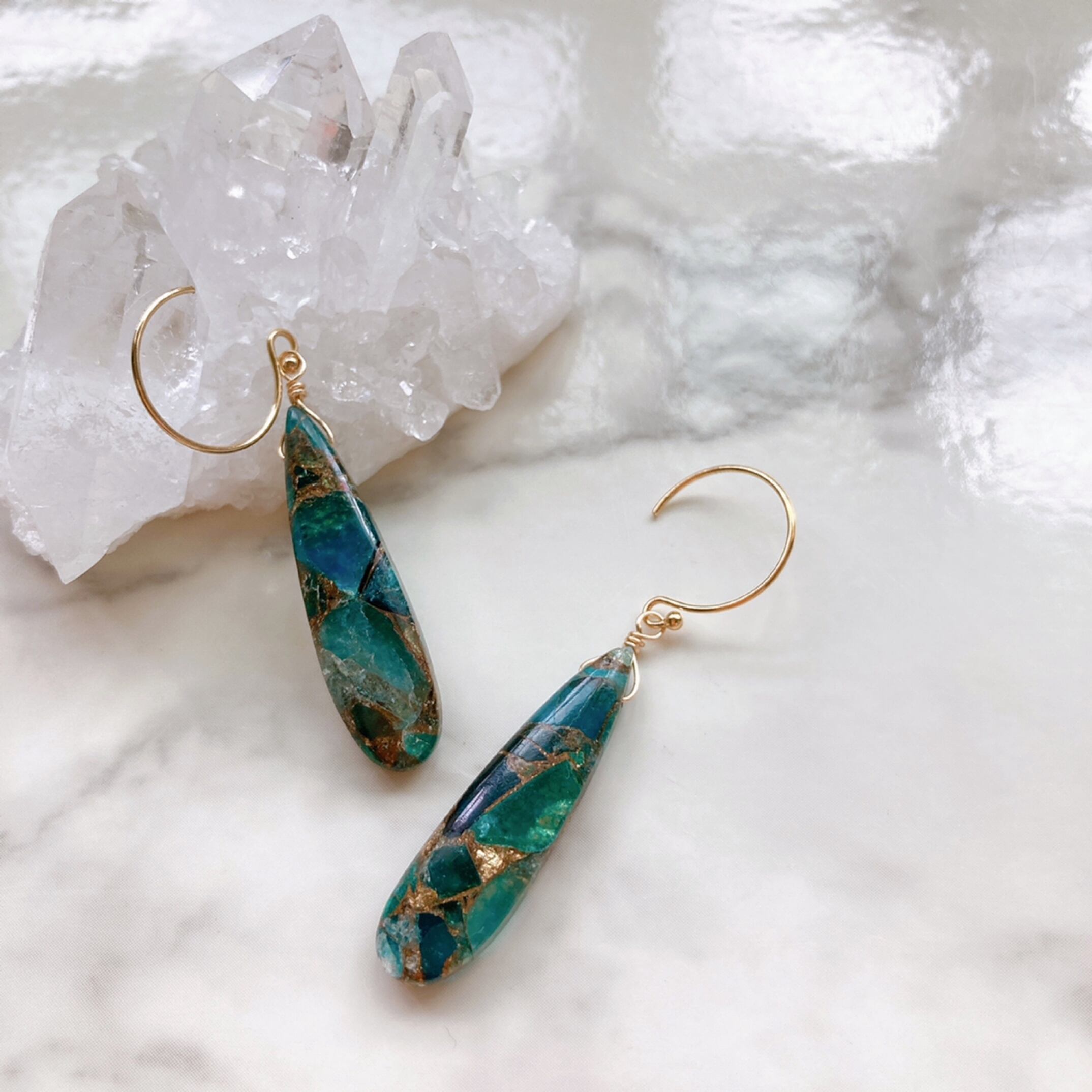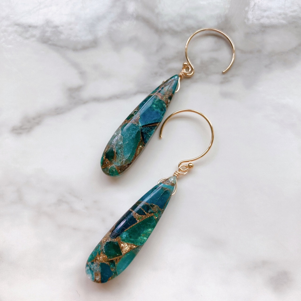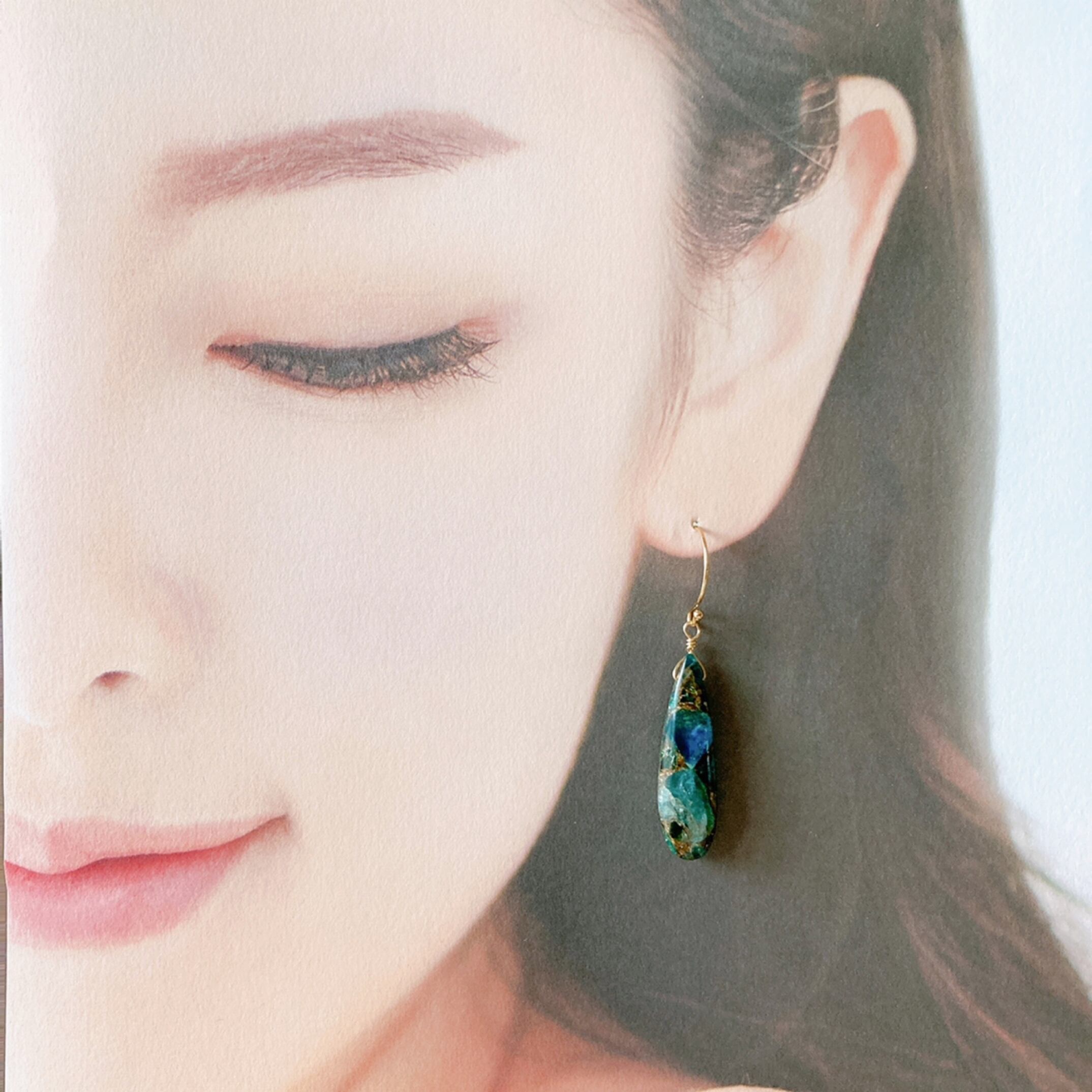 深い森の湖を思わせる美しいコッパービーズを潔く一粒ピアスにお仕立ていたしました。